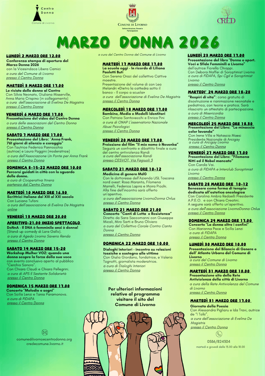 Con l’inaugurazione ufficiale di lunedì 2 marzo alle ore 12.00 al Centro Donna di Largo Strozzi 3, alla presenza della Vicesindaca Libera Camici, prende il via il Marzo Donna 2026 del Comune di Livorno: un mese di appuntamenti gratuiti e aperti alla cittadinanza per promuovere una riflessione collettiva su diritti, parità e cambiamento culturale.